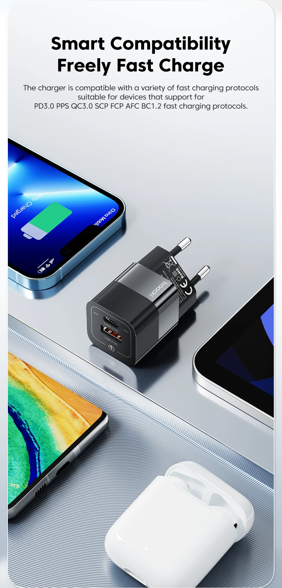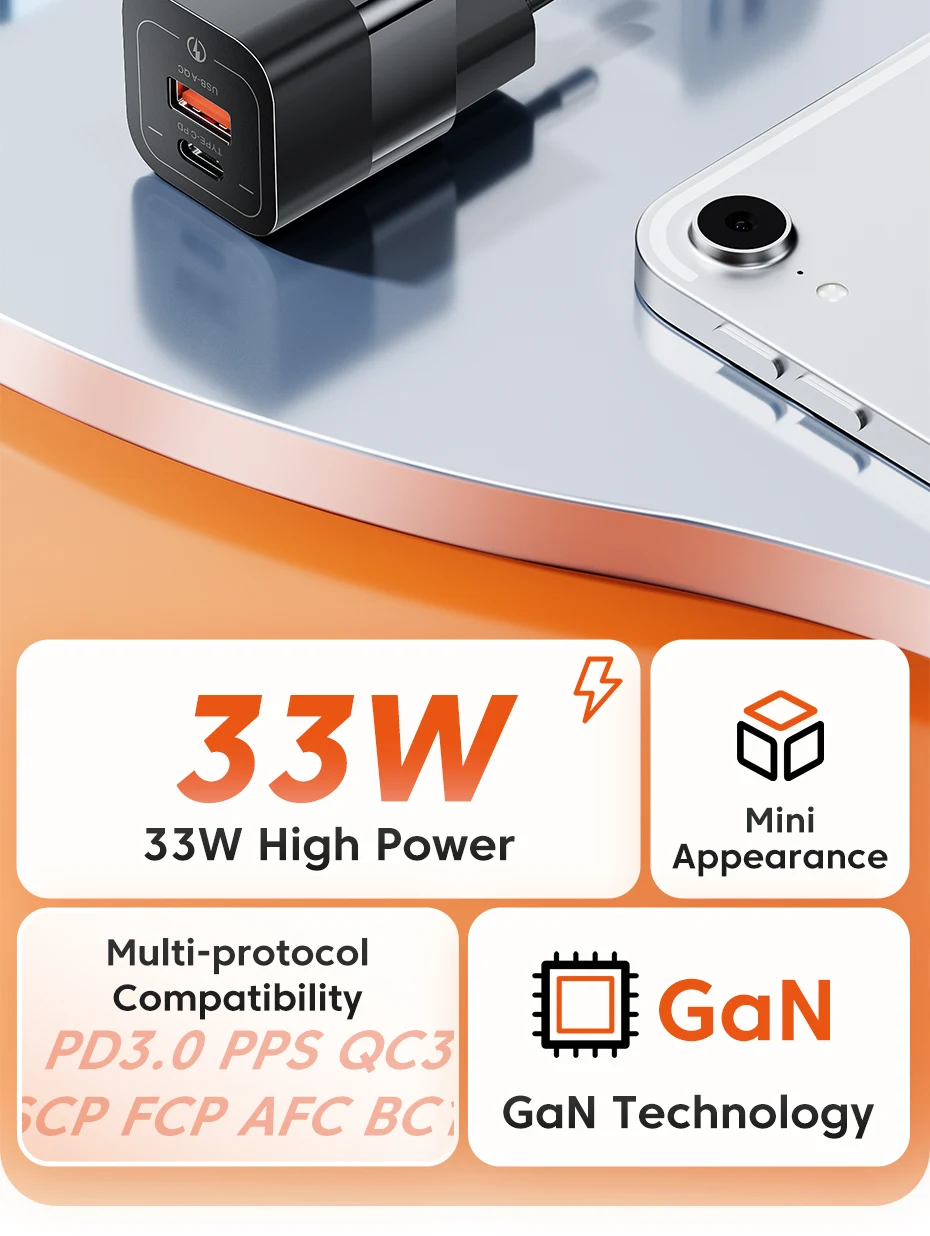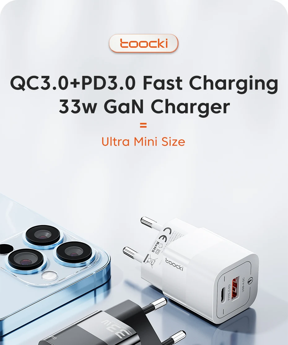 Toocki 33W GaN fast charge the new gallium nitride technology and the chip upgrade bring you smaller volume, better temperature control and higher charging efficiencyThe new gallium nitride technology and the chip upgrade bring you smaller volume, better temperature control and higher charging efficiency. Multi protocol compatibility, supporting PD3.0 PPS QC3.0 AFC FCP SCP BC1.2 for APPLE2.4A and other fast charging protocols, meeting the daily charging of small devices such as laptops, mobile phones and tablets.