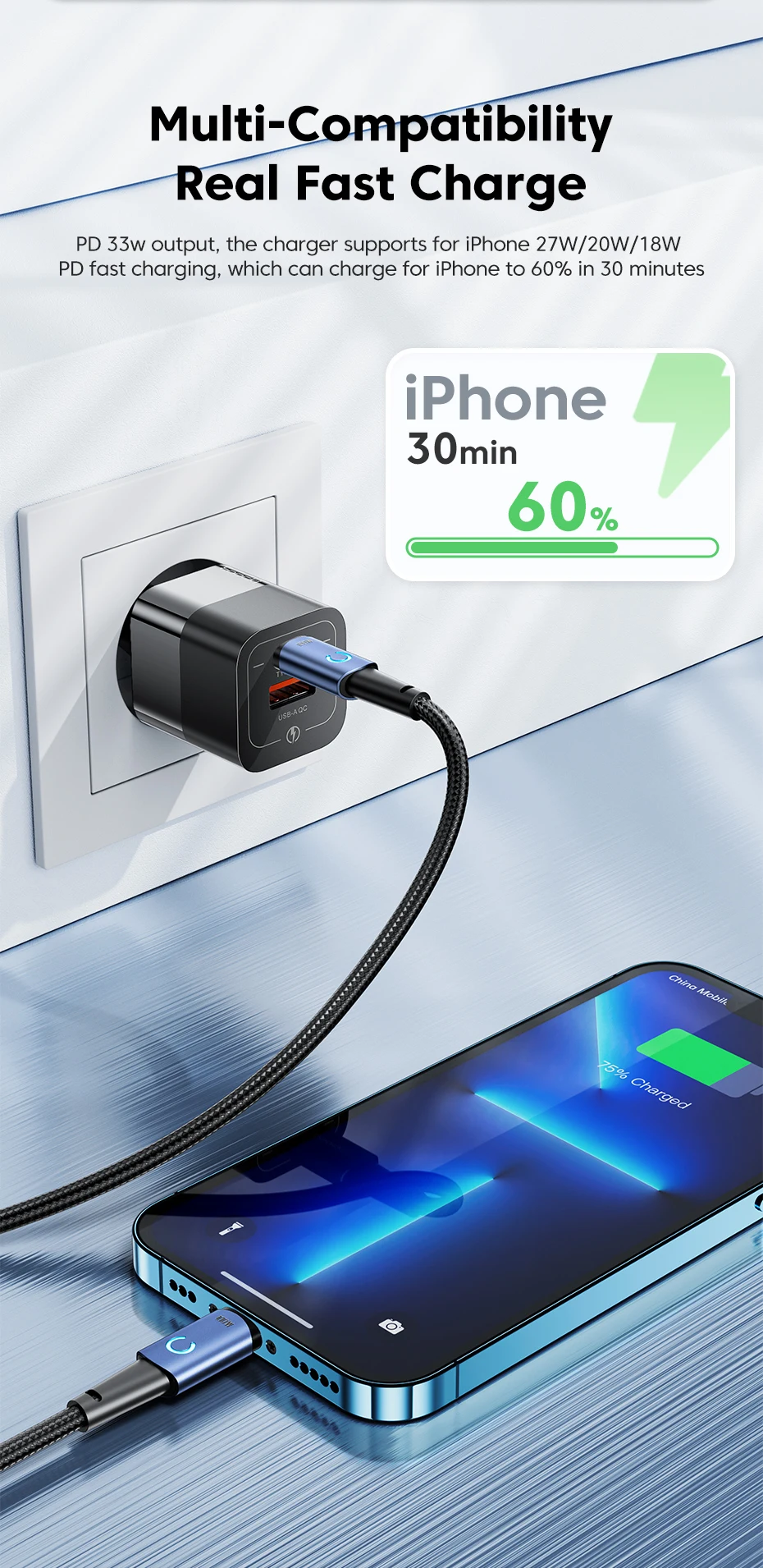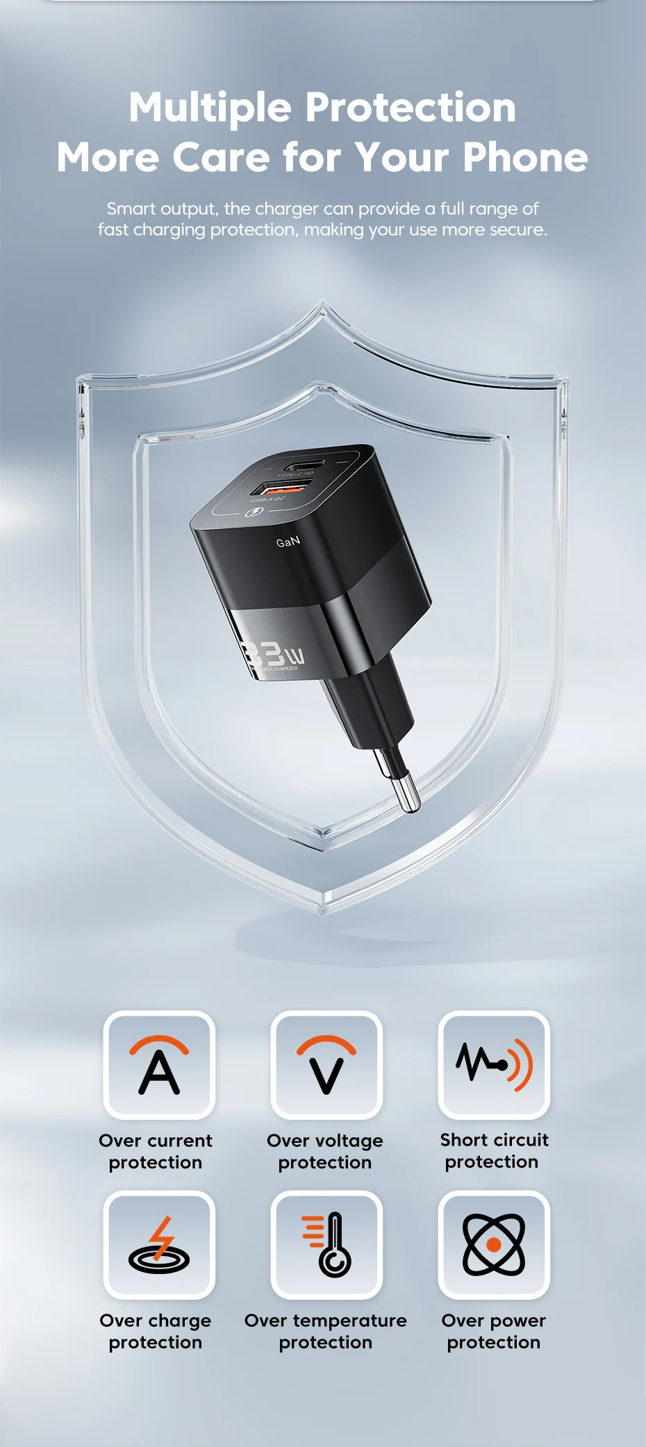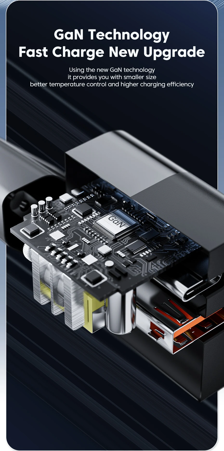 Toocki 33W GaN fast charge the new gallium nitride technology and the chip upgrade bring you smaller volume, better temperature control and higher charging efficiencyThe new gallium nitride technology and the chip upgrade bring you smaller volume, better temperature control and higher charging efficiency. Multi protocol compatibility, supporting PD3.0 PPS QC3.0 AFC FCP SCP BC1.2 for APPLE2.4A and other fast charging protocols, meeting the daily charging of small devices such as laptops, mobile phones and tablets.