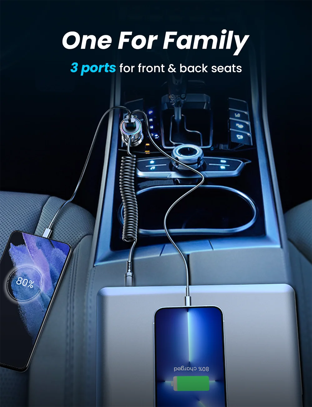 Joyroom 3 Ports Car Charger USB Type C 45W Car Charger with 1.5m Extension Cable QC 3.0 PD 3.0 Fast Charger For iPhone Samsung
