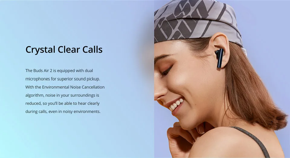 The Buds Air 2 is equipped with dual microphones for superior sound pickup. With our ENC environmental noise reduction algorithm, noise in your surroundings is reduced, so you’ll be able to hear clearly during calls, even in noisy environments.