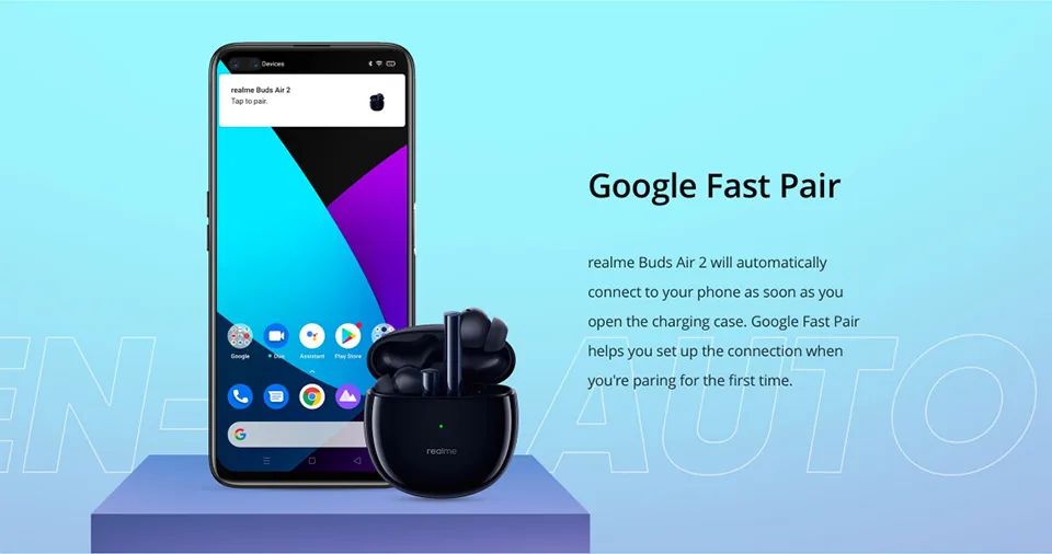 realme Buds Air 2 will automatically connect to your phone as soon as you open the charging case. Google Fast Pair helps you set up the connection when you're praying for the first time.