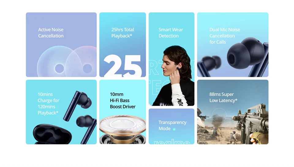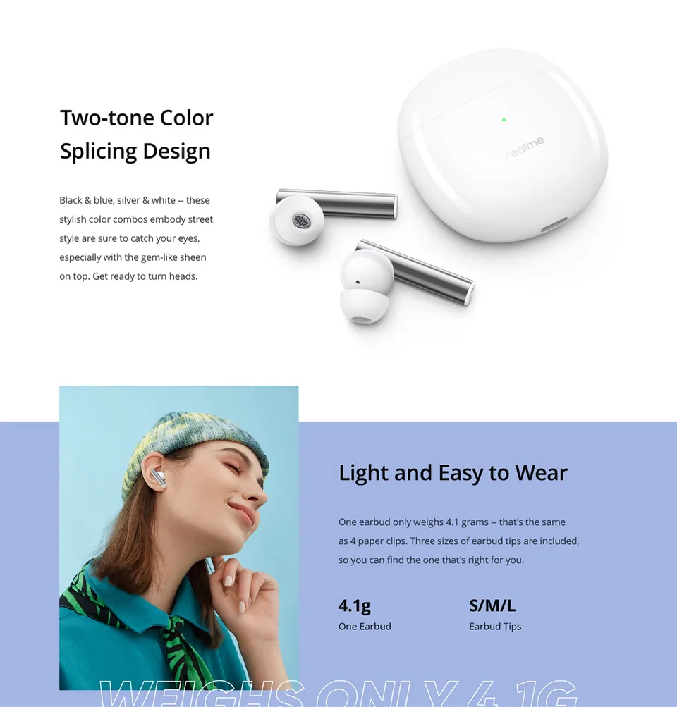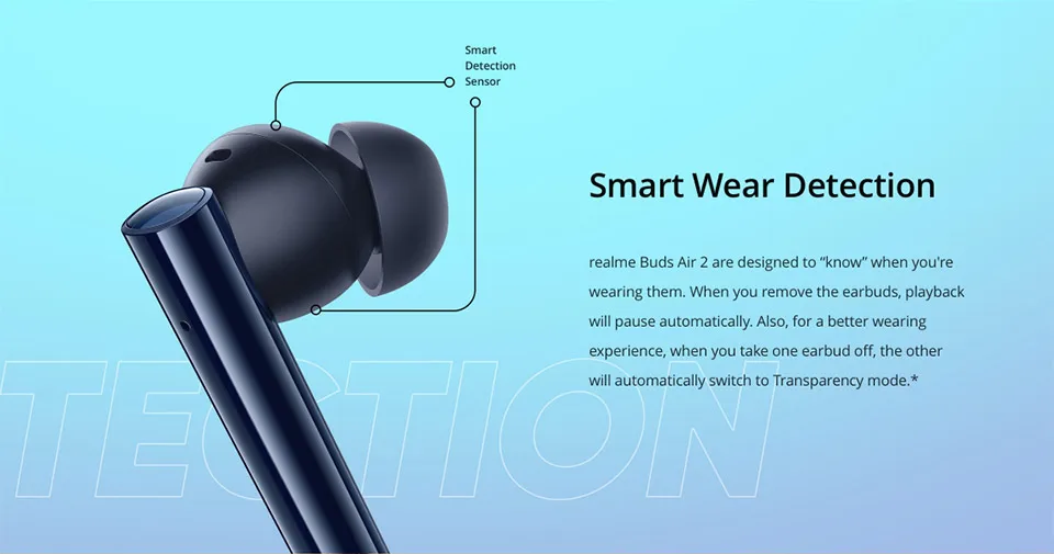 realme Buds Air 2 are designed to “know” when you're wearing them. When you remove the earbuds, playback will pause automatically. Also, for a better wearing experience, when you take one earbud off, the other will automatically switch to Transparency mode.*