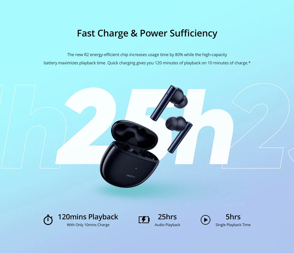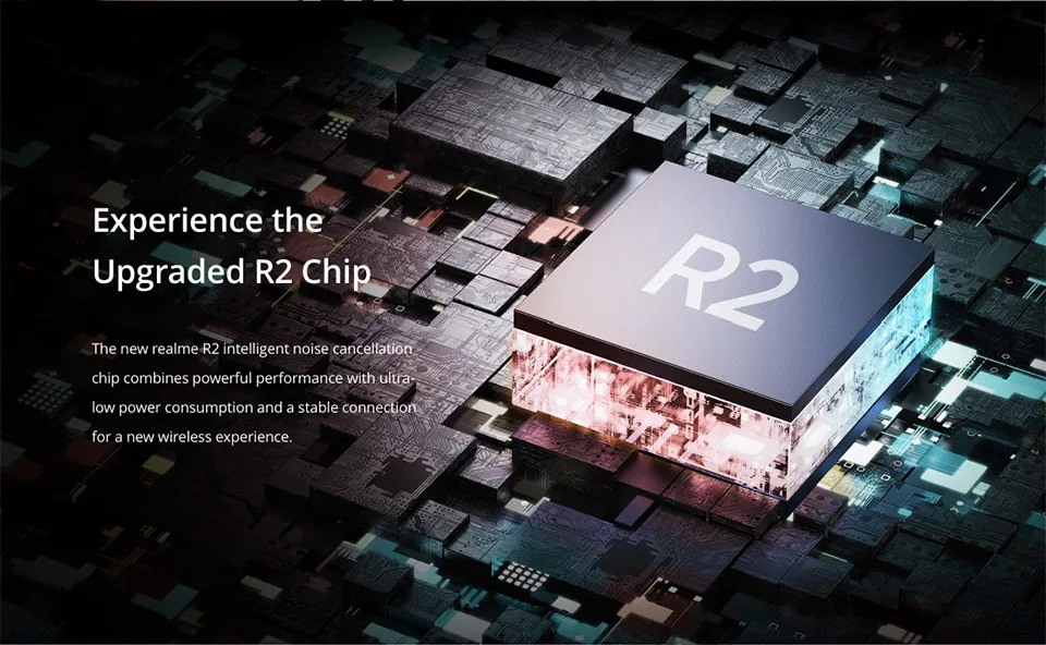The new realme R2 intelligent noise cancellation chip combines powerful performance with ultra-low power consumption for a stable connection and a new wireless experience.