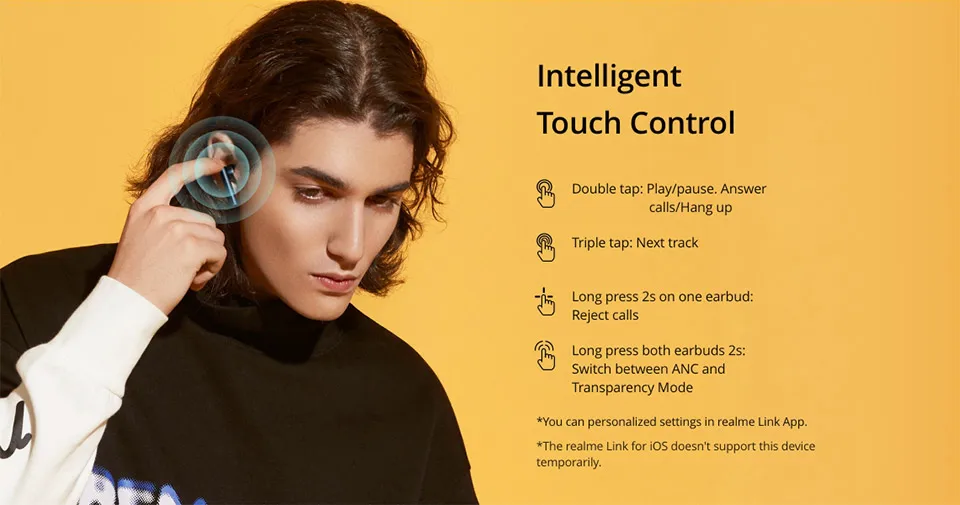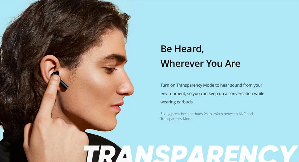 Long press both earbuds 2s: Switch between ANC and Transparency Mode